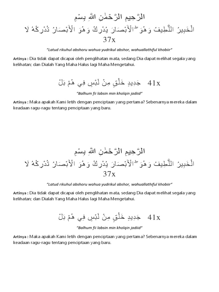 Fadhilah Laa Tudrikuhul Abshoru from 2.bp.blogspot.com << lâ tudrikuhul ebsâru ve huve yudrikul ebsâr ve huvel lâtiful habir >>. Ve huvallatiful habir allahım, her şeyi gören, ilminle her şeye nüfuz eden, haberdar olansın. La tudrikuhul ebsaru ve huve yudrikul ebsar ve huvel latiful habir. Lâ tudrikuhul ebsâru ve huve yudrikul ebsâr(ebsâra) ve huvel lâtîful habîr(habîru). gözler o'nu idrak edemez ama o, gözleri idrak eder. Kovulmuş şeytandan allah'a sığınırım rahman ve rahim olan allah'ın ismiyle. Dia (allah) tidak bisa dicapai. Arti dari ayat 103 surah al an'am (binatang ternak): وَبِالْأَسْمَاءِ الَّتِي دَعَاكَ بِهَا أَيُّوبُ 129 aded (lâ tudrikuhul ebsâru ve huve yudrikul ebsâr ve huvel lâtîful habîr.(en'am 103).